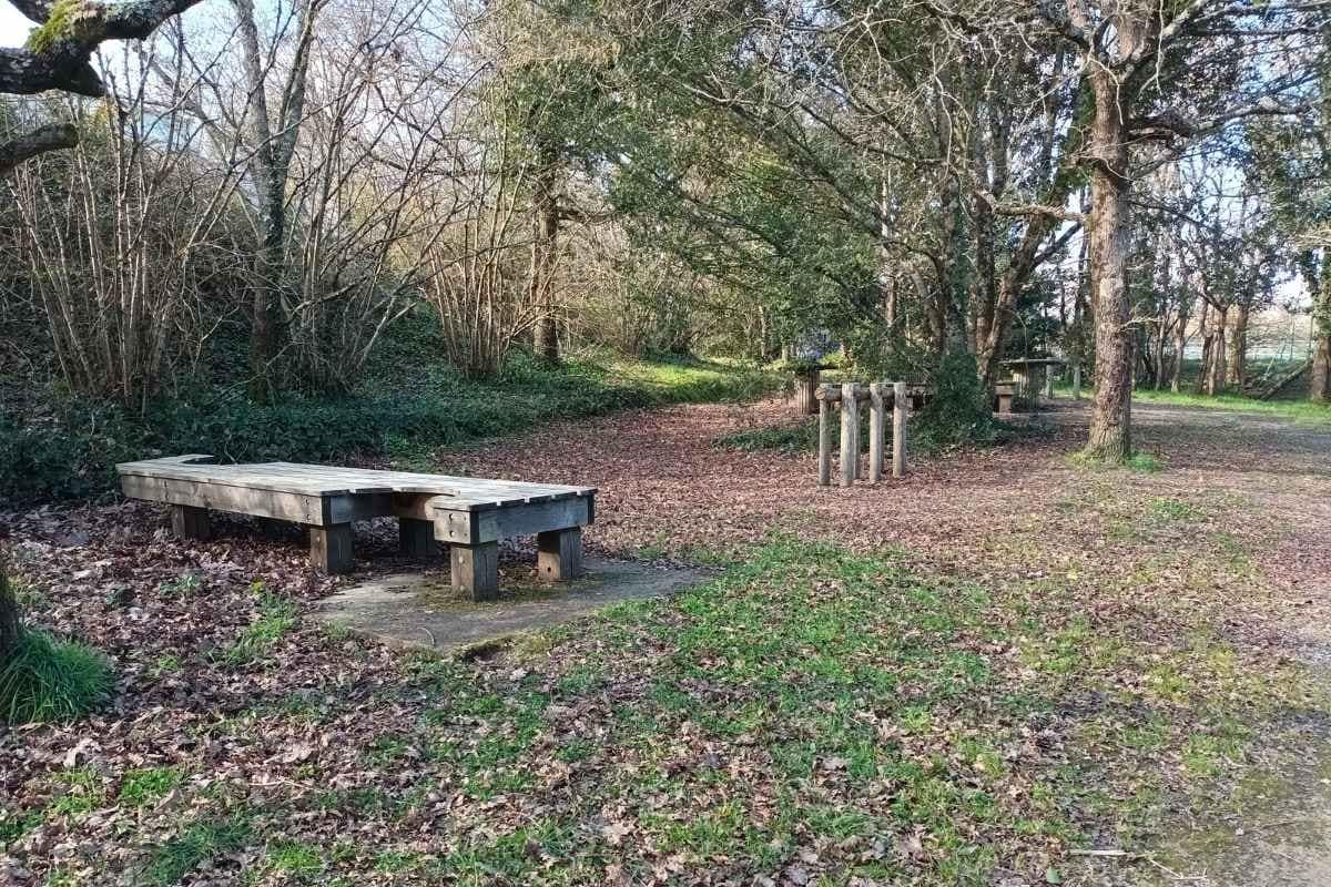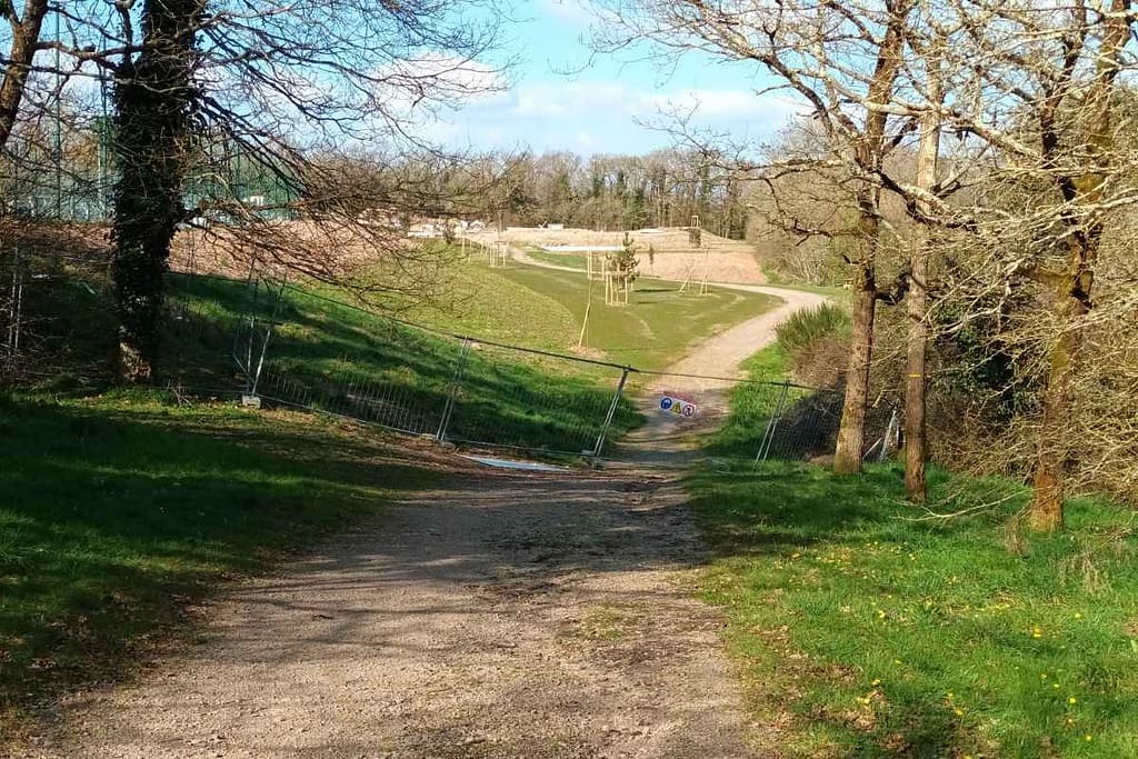 Un peu plus loin, une barrière de chantier nous empêche de continuer notre exploration. Derrière, nous apercevons de nombreuses tables de pique-nique… Dommage, ce sera pour une prochaine fois ! Nous faisons donc demi-tour, ce qui semble ravir Zitou qui apprécie visiblement ce lieu autant que moi.