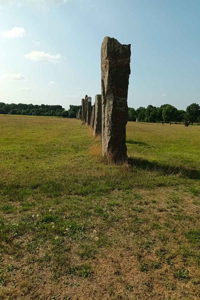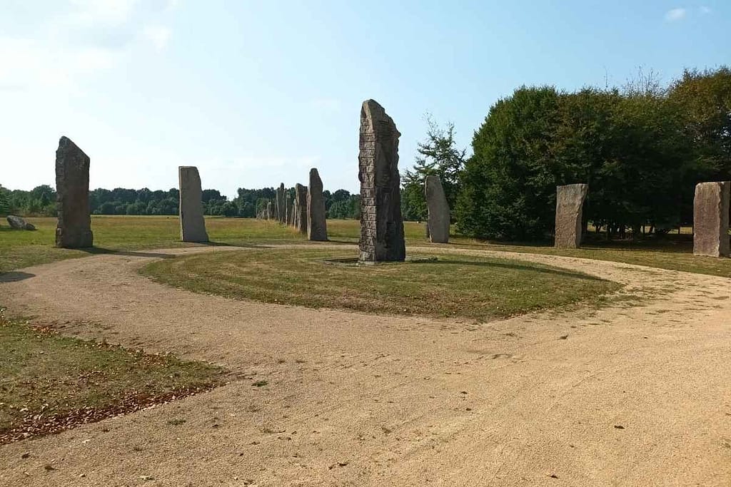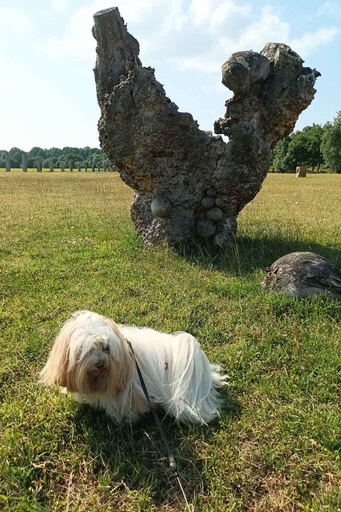 Ce parc a été imaginé et façonné par le sculpteur Jean-Claude Lambert. Dès l’entrée, avec Zitou à mes côtés, la première impression est forte : de grandes sculptures en granit se dressent dans le paysage, dans un alignement saisissant. Le silence n’est troublé que par le vent dans les feuilles et le chant des oiseaux, ce qui rend l’ambiance paisible et presque méditative.