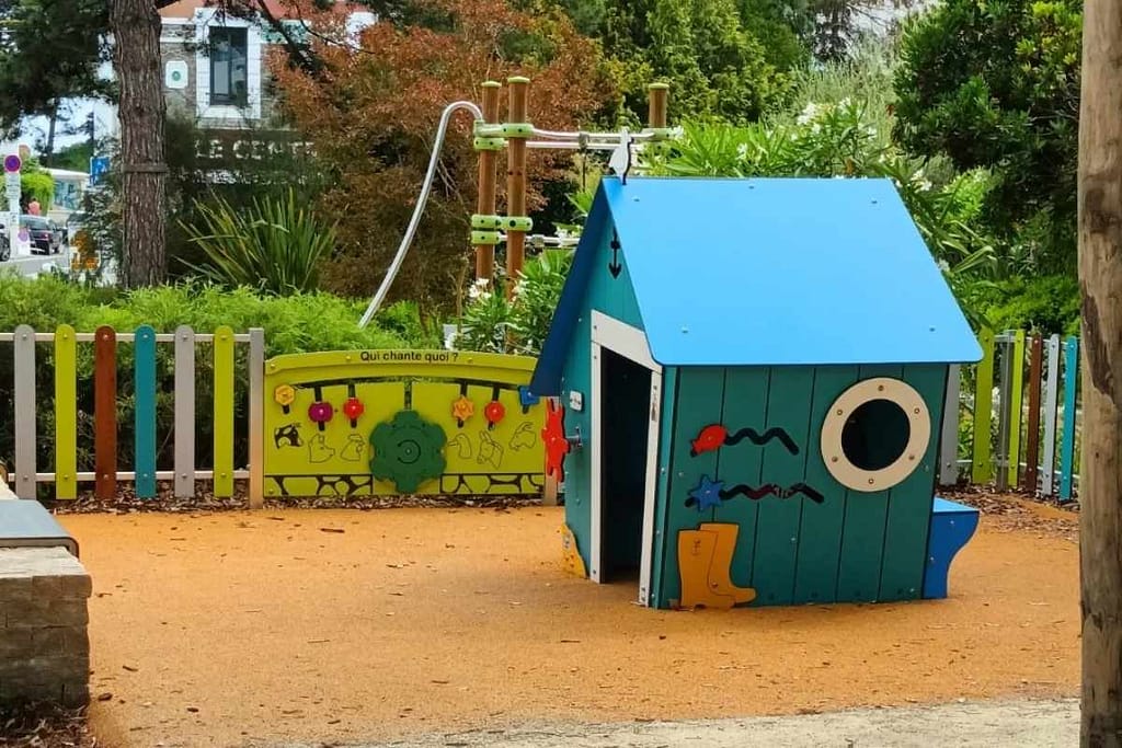 Dès le portail blanc franchi, on emprunte un chemin de terre qui mène à différentes plantations. Des fauteuils en bois sont disposés ici et là pour s’asseoir quelques minutes et profiter du calme du jardin. Plus loin, l’ambiance devient plus champêtre : on traverse un petit verger avant de rejoindre l’aire de jeux.