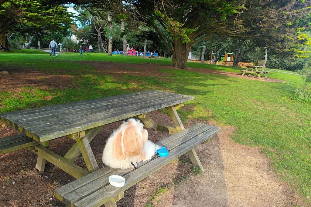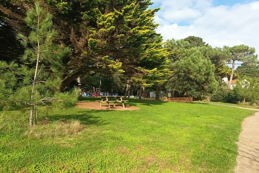 À droite, le parc offre des aires de jeux, des tables de pique-nique à l’ombre et des sanitaires.