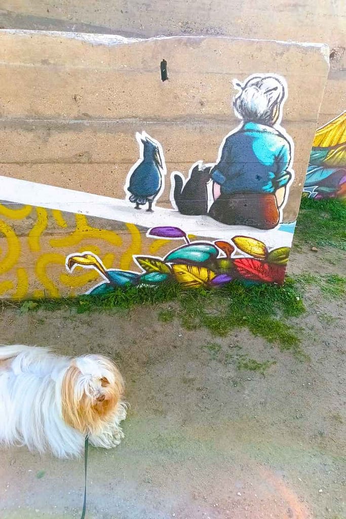 Leur travail joue sur les lignes, les couleurs et surtout les anamorphoses, ces formes visibles uniquement sous certains angles. Le béton brut devient alors support artistique — et le contraste avec l’océan est superbe.