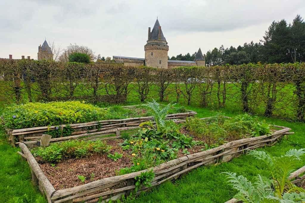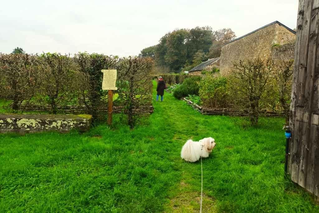 Nous poursuivons notre exploration en découvrant les jardins aux abords du château, une reconstitution inspirée des espaces verts du XIVe siècle. Ce jardin médiéval est un condensé des trois jardins typiques de l’époque : un jardin de château, un jardin de monastère et un jardin de paysans. Sur près de 2 000 mètres carrés, on découvre un potager avec des légumes anciens, comme le panais, ainsi qu’un verger. Zitou semble tout aussi curieux que moi de ces lieux empreints d’histoire.