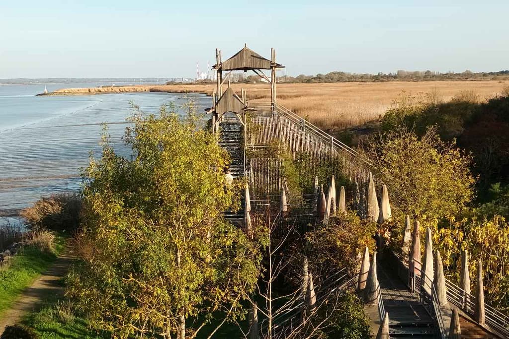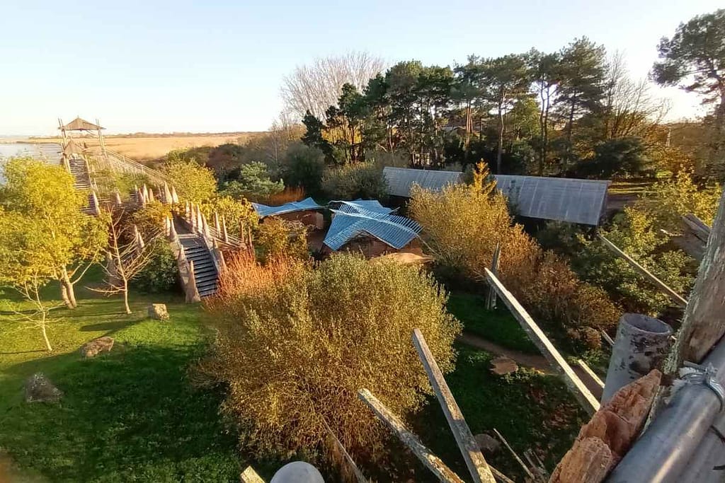 À peine arrivés, nous passons sous une arche qui mène à une structure en bois, magnifiée par le tapis de feuilles automnales qui craquent sous nos pas. Nous avançons jusqu’à pénétrer sous une alvéole percée de trous, qui rappelle des décors futuristes. Plus loin, un escalier métallique nous invite à prendre de la hauteur pour admirer la vue.
