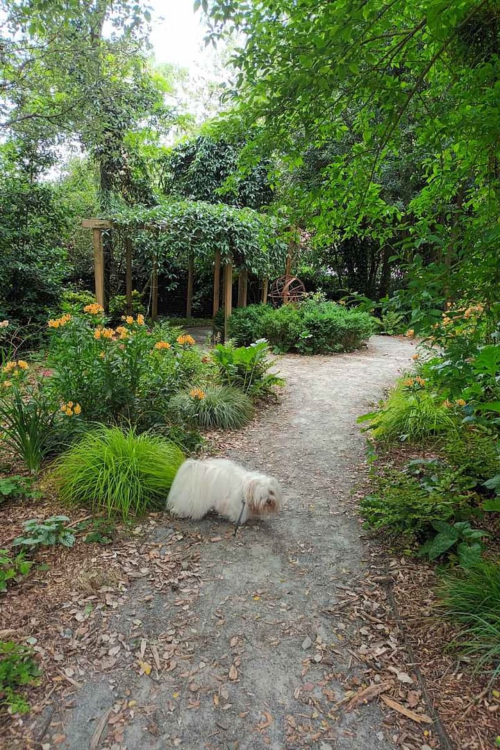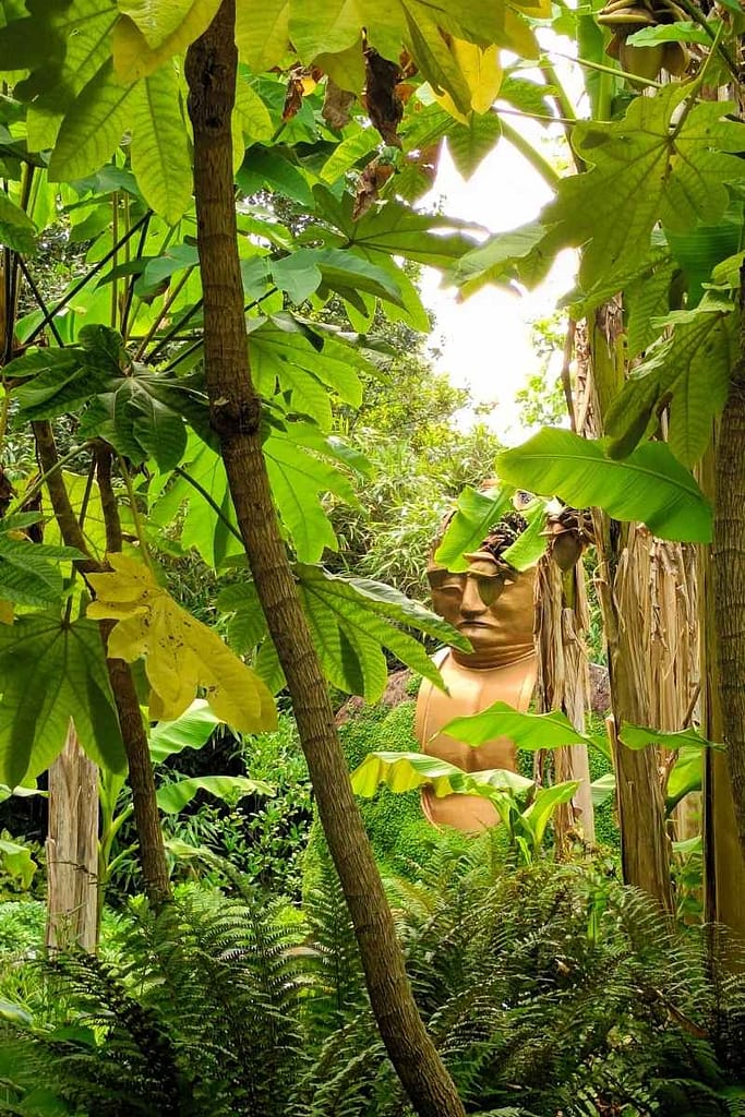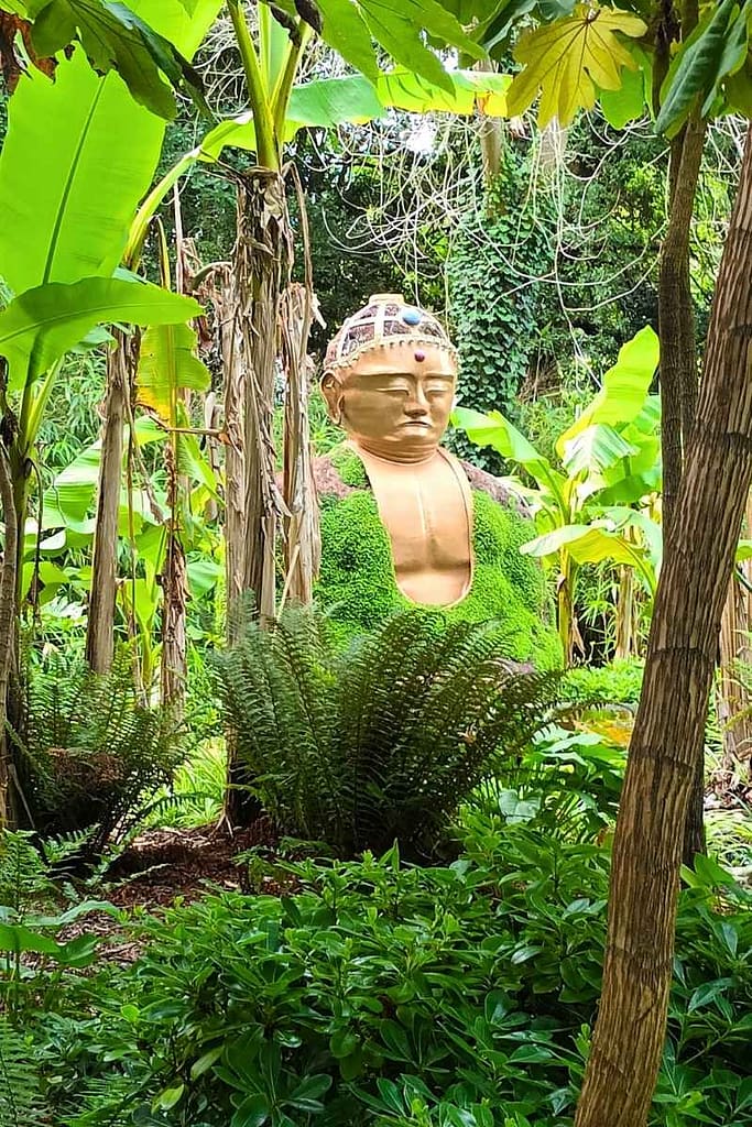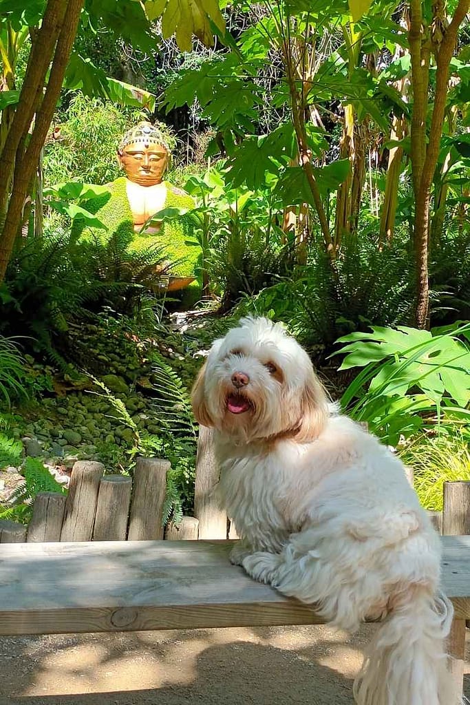 Au fil de nos pas, nous passons entre les pelouses, les zones boisées et même un espace asiatique où poussent bananiers et bambous. C’est d’ailleurs près de la statue du Bouddha que Zitou se sent le mieux. Comme moi, il semble percevoir l’énergie douce et apaisante qui se dégage de ce coin.