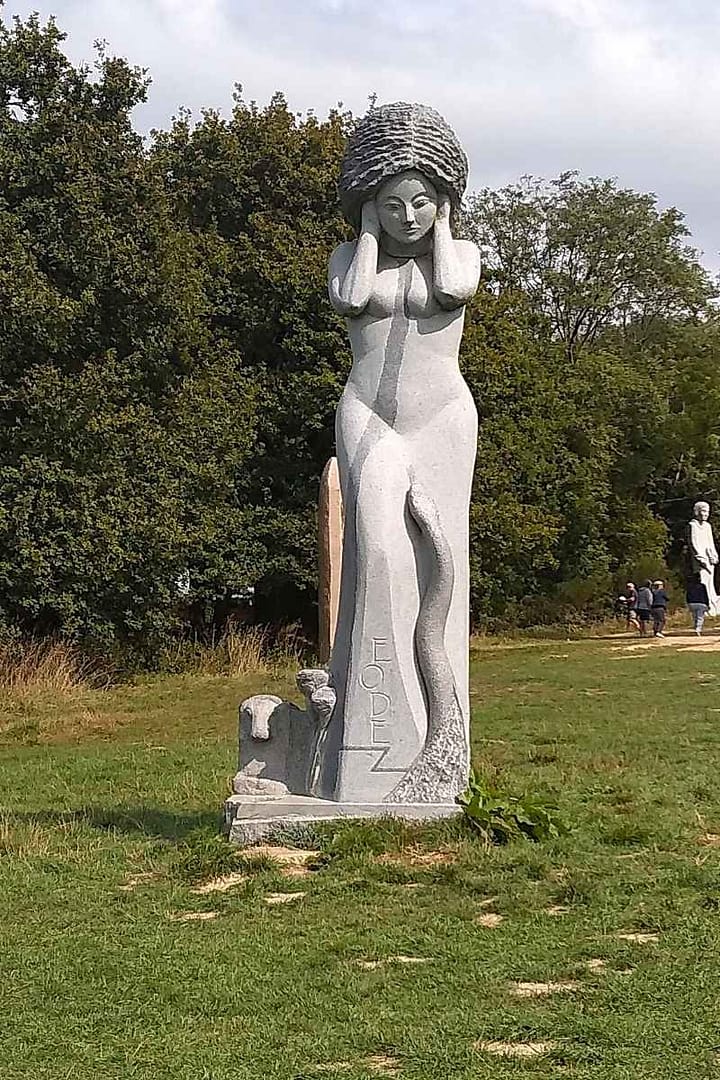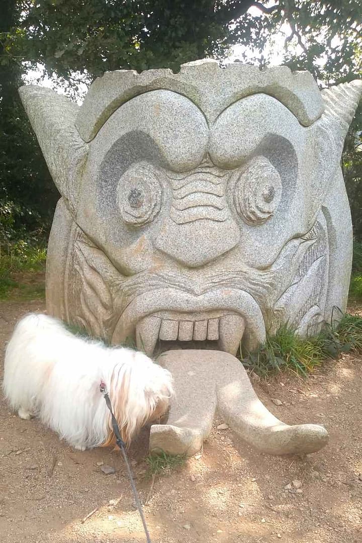 Grâce au GPS, trouver le site a été un jeu d’enfant. Dès notre arrivée sur le parking, nous avons été accueillis par Eode, une première statue qui donne le ton. Puis, en avançant, nous avons découvert la vallée, et quel spectacle ! Une immense étendue vallonnée, parsemée de statues monumentales taillées dans le granit breton, s’offrait à nous. Chacune raconte une histoire, chaque détail est travaillé avec finesse. Zitou et moi avons immédiatement été séduits.