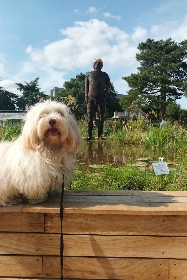 En sortant du restaurant, nous avons croisé l’Enfant Hybridus, une sculpture intrigante du Voyage à Nantes. Après quelques tentatives photo perturbées par les passants, nous avons fini par obtenir un joli souvenir canin devant cette œuvre.